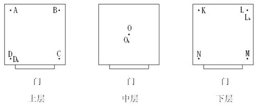 在被恒溫恒濕試驗(yàn)箱工作室內(nèi)定出上、中、下三個水平層面(簡稱上、中、下三層),上層與工作室頂面的距離是工作室高度的1/10,中層通過工作室?guī)缀沃行狞c(diǎn)O,下層在底層樣品架上方10mm處。 恒溫恒濕試驗(yàn)箱測量點(diǎn)分別位于上、中、下三層,如圖1和圖2。 溫度測量點(diǎn)用O、A、B、C、D、E、F、G、H、J、K、L、M、N、U表示。 相對濕度測量點(diǎn)用Oh、Dh、Hh、Lh表示。 工作室容積不大于2m3時,溫度測量點(diǎn)為9個,相對濕度測量點(diǎn)為3個
