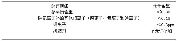 鹽霧試驗(yàn)箱的鹽溶液應(yīng)當(dāng)按溶解比例為5±1份的氯化鈉,和95份的水配置,水要符合說明D1193類型Ⅳ中的要求(除了本規(guī)程對(duì)氯離子的限制外,鈉離子可以忽略)。對(duì)于鹽的化學(xué)成分要謹(jǐn)慎小心才行,使用的鹽應(yīng)為氯化鈉,總的雜質(zhì)量不超過0.3%。除氯離子外的其他鹵素離子(溴離子、氟離子和碘離子)的含量應(yīng)低于鹽的含量的0.1%(質(zhì)量),銅離子含量要小于總量的0.3ppm,添加抗結(jié)劑的氯化鈉不允許使用,因?yàn)榇祟愄砑觿┢鹂垢g劑的作用。表1列出了的雜質(zhì)含量的限制。