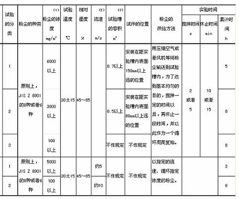 4、試驗(yàn)方法 將試件按照正式使用狀態(tài)安裝在試驗(yàn)裝置上,原則上使用JIS Z 8901(試驗(yàn)用粉塵)所規(guī)定的試驗(yàn)用粉塵(以下簡(jiǎn)稱“粉塵”),按照表2的試驗(yàn)條件進(jìn)行試驗(yàn)。但是,對(duì)于氣流試驗(yàn)時(shí)的試件的安裝,盡量將塵埃氣流的方向與實(shí)車安裝時(shí)所承受的氣流方向相一致。