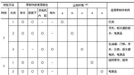 5. 適用基準(zhǔn) 塵埃試驗(yàn)的適用基準(zhǔn),按照零部件所處環(huán)境及零部件的使用部位進(jìn)行分類,原則上如表3所示。 附注 表中帶有圓圈符號(hào)“○”的欄目,表示適用的場(chǎng)合。 6、評(píng)價(jià) 按照“4.”進(jìn)行試驗(yàn),檢查零部件的品質(zhì)、性能以及粉塵的侵入程度。 JIS D 0207-1997 汽車零部件的防塵及耐塵試驗(yàn)通則解說